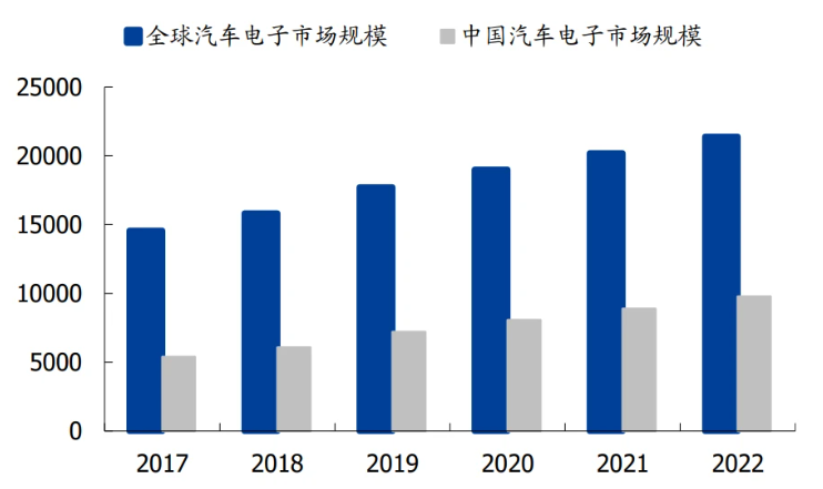 随着新能源汽车市场的快速发展,电子化、电动化、智能化的发展趋势驱动汽车电子市场的增长。根据中国汽车工业协会的数据显示,在政策、环保、技术及消费多方面的牵引下,汽车电子市场规模呈稳步增长态势,2022年全球汽车电子规模预计将超过21000亿元,其中我国规模将超过9700亿元。