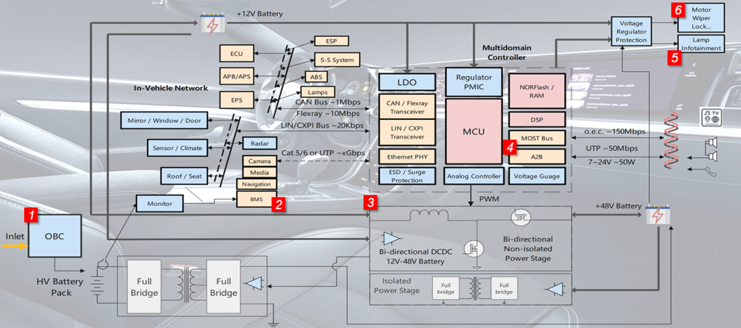 汽车中的许多电子负载都是12V驱动,而为了增强总线和额外的节能电源,当下已经采用48V系统,其中在EV或HEV中,48V电池由高压电池组或牵引电池充电。为了满足不同电压总线的要求,需要在车身的电源系统安装12V-48V双向转换器;同时为满足不同功能现场通电的要求,这两种转换器都带有隔离或非隔离的 DC-DC 转换器。